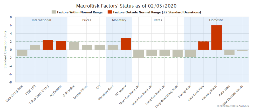 It looks like times are better for U.S. farmers, and this is shown in the “economy status” chart published on MacroRisk.com. This graph shows the current economy as expressed by 18 key macroeconomic factors, including U.S. agricultural exports. The chart shows a “z-score” relative to a historical average and the bars in red are those which are more than two standard deviations away from their historical values.