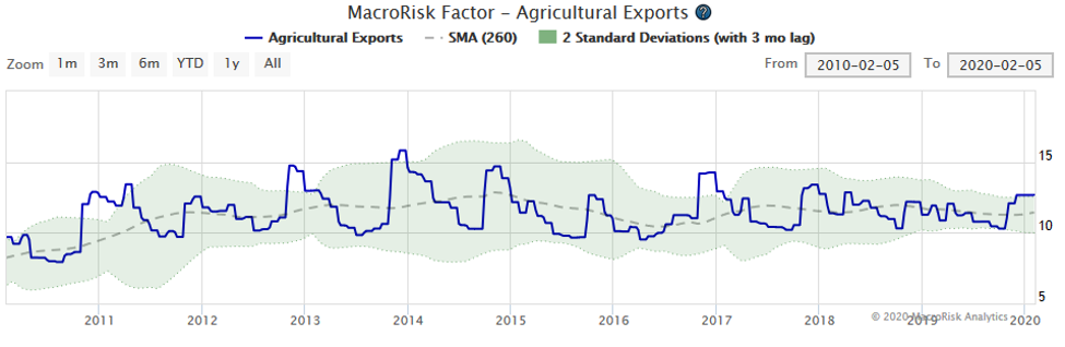 The MacroRisk.com economic status as of 2/5/2020 shows that ag exports are one of five economic variables currently above their historical values. (The others are the Tokyo Stock Exchange index, the M2 Money Supply, Corporate Cash Flows, and Housing Starts.)