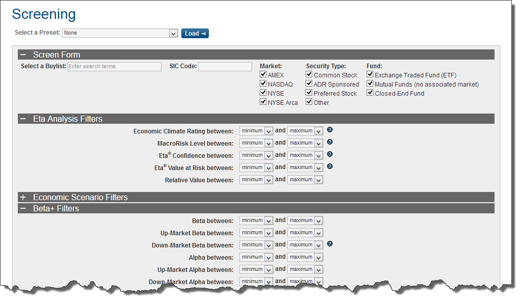 Screening helps you find securities that meet your clients’ goals and needs while uncovering economic opportunities. Select from any combination of available markets and security types, along with MacroRisk Analytics Eta Analysis factors, such as the MacroRisk Level (MRL), Economic Climate Rating (Stars) and Eta Confidence. Advanced Screening adds additional screening conditions, including positive or negative individual Eta Measures and the Up- and Down-Market Beta+ values.